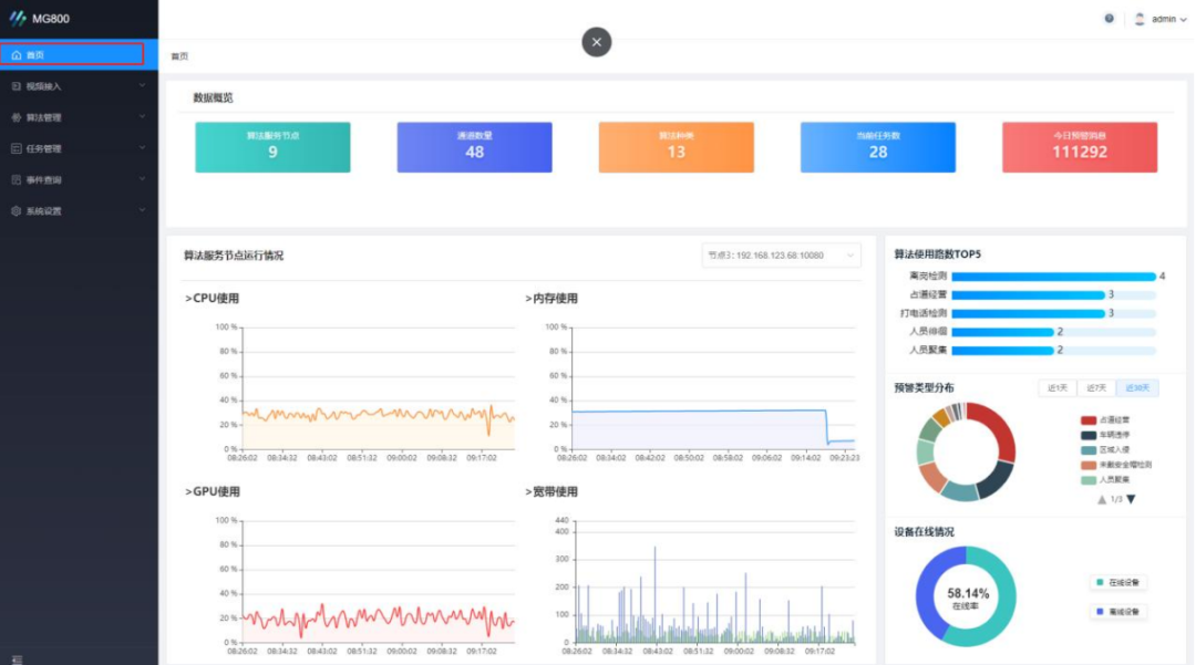 同時,MG800支持對算法包的升級、授權,也可按需對算力資源進行動態(tài)調(diào)度,實現(xiàn)算力資源的最大化利用。 大規(guī)模并發(fā)能力,方便快速集成 MG800充分利用GPU計算能力,解決數(shù)據(jù)密集計算問題,提升視頻分析并發(fā)性能。目前,可支持5000路攝像頭接入,并可持續(xù)擴充。平臺支持RTSP協(xié)議或GB28181協(xié)議等多種標準協(xié)議接入,支持多種編碼格式的視頻流分析,提供豐富邊界的標準接口服務。