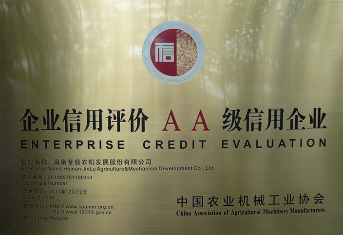 2012年12月12日,在山東青島召開的2012年全國農(nóng)機(jī)工業(yè)工作會議暨中國農(nóng)業(yè)機(jī)械工業(yè)協(xié)會五屆二次理事大會上,隆重表彰了全國67家農(nóng)機(jī)行業(yè)獲得A級以上企業(yè)信用等級的企業(yè),來自國家農(nóng)業(yè)部、工信部、農(nóng)機(jī)院、農(nóng)機(jī)協(xié)會等領(lǐng)導(dǎo)出席了授牌儀式,海南金鹿農(nóng)機(jī)發(fā)展股份有限公司在信用評價過程中榮獲AA級稱號。