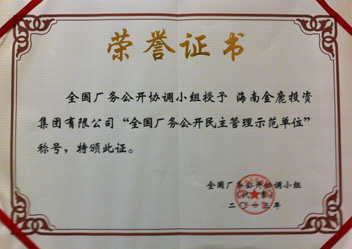 10月28日,金鹿集團公司被全國廠務公開協(xié)調(diào)小組授予“全國廠務公開民主管理示范單位”榮譽稱號,是海南省兩個示范單位之一。