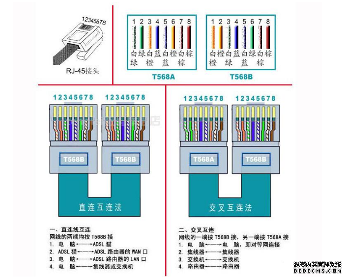 交叉線:一頭按T568A線序連接,一頭按T568B線序連接。具體連接情況: